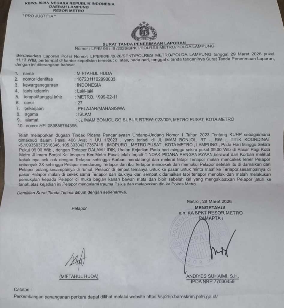 Kasus ini kini telah dilaporkan ke Polres Metro dengan nomor LP/B/96/III/2026/SPKT/Polres Metro/Polda Lampung. Polisi masih melakukan penyelidikan terkait dugaan tindak pidana penganiayaan.